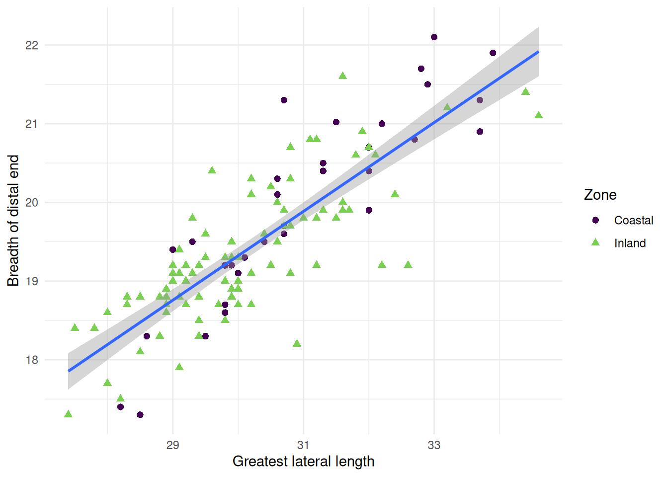 Now we can see the relationship (or lack thereof) in the measurements of sheep astragali between the Zones of occupation. To really drive home the relationship between the variables we can add a curve with geom_smooth()