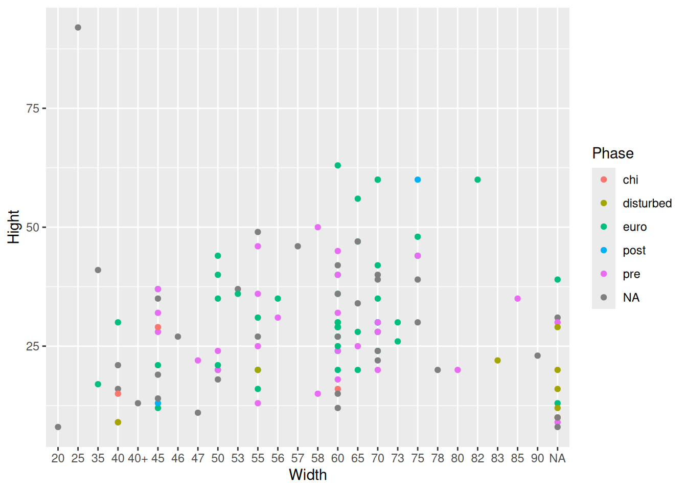 raw_data ggplot(aes(x = Width, y = Hight, col = Phase)) + # change to Hight